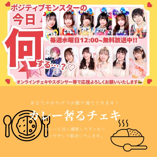 2025.12.24(水)分 【ポジティブモンスターの「今日何する…?♡」】 事前にご購入頂いた分だけ当日該当の出演者がカレーを食べることが出来ます☆ チェキ撮影し、落書きを入れたチェキを後日郵送させて頂きます。 ぜひご購入よろしくお願いします! ※コンビニ決済にてご購入の方は、配信時間までに入金をお願い致します。 未入金の場合はその場でお撮りすることが出来ませんので予めご了承ください。 ※出演者都合によるご購入商品のキャンセルはご対応致しかねます。予めご了承ください。