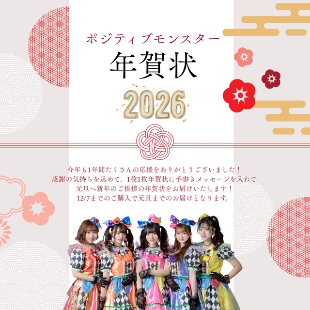 【2026メッセージ動画付き年賀状】 今年も沢山の応援をありがとうございました! 皆様へ感謝の気持ちを込めて、1枚1枚年賀状に手書きメッセージを入れて元旦へ新年のご挨拶の年賀状をお届けいたします。 2026年もよろしくお願いします! 各ユニット枚数1位メンバーにはご褒美プレゼントあり&授与式あり!(2位にもプレゼントあり) 12/7までのご購入で元旦までのお届けとなります。 3500円 ◾︎ポジティブモンスター(各メンバー全3種) ◎年賀はがきを封筒に入れて封書年賀として発送いたします! ◎直筆メッセージ付きです♪ ◎各デザイン3種ご用意いたしますので、複数購入も大歓迎☆ (例:佐伯夏海/3種、桃瀬あやな/3種、など) ◎皆さんへ向けたメッセージ動画が閲覧できるQRコードつき! 動画種類は全3パターンございます♪ (個別メッセージではございませんので予めご了承ください。) ◎ポジモン年賀状には、写真1枚無料券として3月いっぱいまで使用可能!(ワンマン使用不可) ※販売期間は12月7日23:59までとなります。お早めのご購入をよろしくお願いします。 ※元旦を過ぎての到着で良いという方は、12月8日以降に第2弾の年賀状販売をいたします。年賀状のデザインや動画内容は今回と同様となります。 ※星乃愛璃咲はひまわりが咲く頃にとは別のデザインとなります。