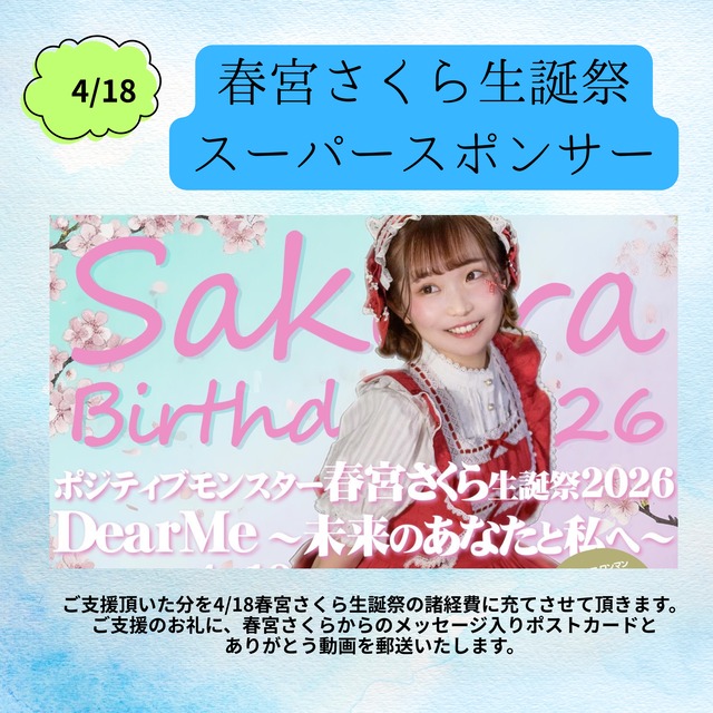 春宮さくら生誕祭 スーパースポンサープラン ご支援頂いた分を4/18春宮さくら生誕祭での諸経費に充てさせて頂きます。 ご支援のお礼に春宮さくらからメッセージ入りポストカードとありがとう動画を郵送致します。 春宮さくら→https://x.com/sakura3_circle ※4/1(水)23:59締切となります。お早めのご購入よろしくお願いします。 ※ポストカードの郵送は4月18日以降の予定です。