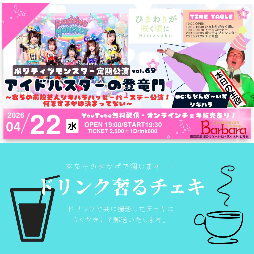 2026/04/08(水)2026/04/22(水)ポジティブモンスター定期公演『アイドルスターの登竜門vol.69~#スタモン~我らの前説芸人シギハラハッピーバースデー公演!何をするかは決まってない〜』