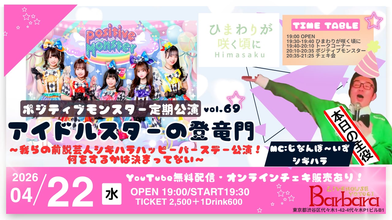 2026/04/22(水)ポジティブモンスター定期公演『アイドルスターの登竜門vol.69~#スタモン~我らの前説芸人シギハラハッピーバースデー公演!何をするかは決まってない〜』